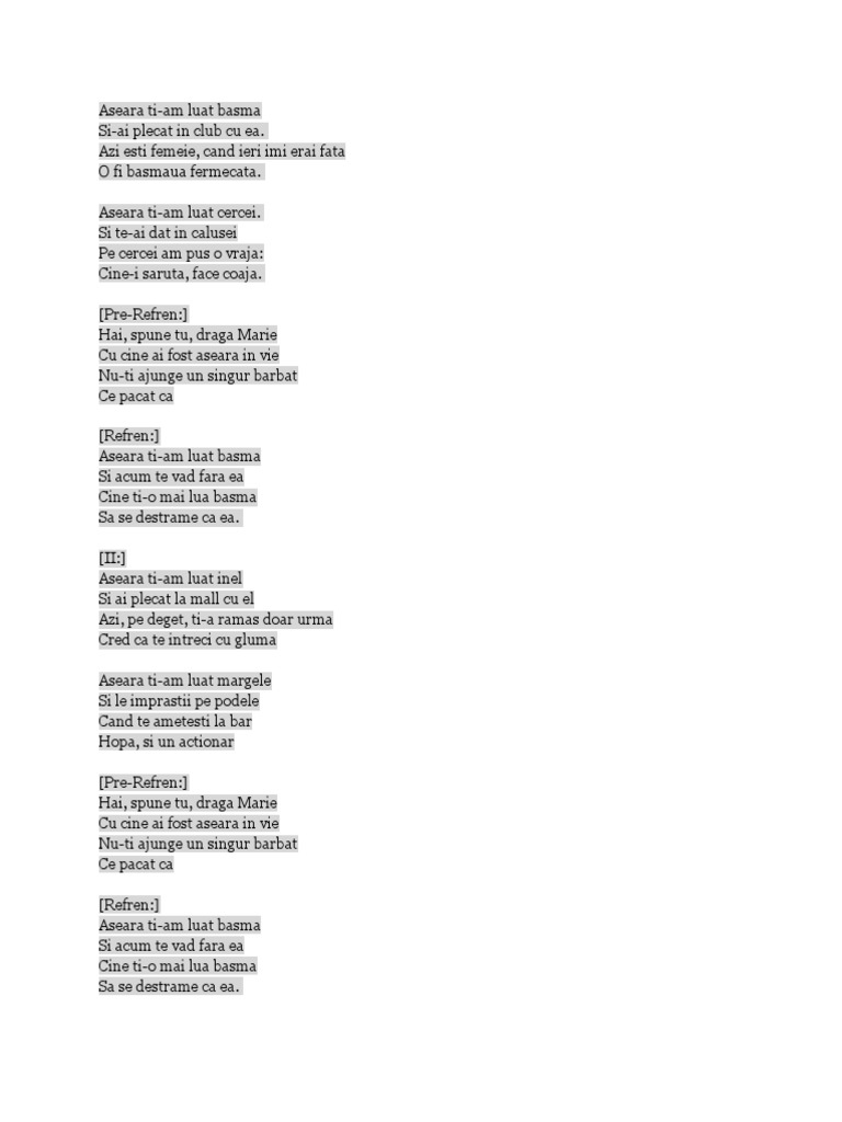 Sprijinirea site ului de către dvs contează mult pentru noi. Aseară ti am luat basma. Maria tanase aseara ti am luat basma. Pre refren hai spune tu draga marie cu cine ai fost aseara in vie nu ti ajunge un singur barbat ce pacat ca refren aseara ti am luat basma si acum te vad fara ea cine ti o mai lua basma sa se destrame ca ea.