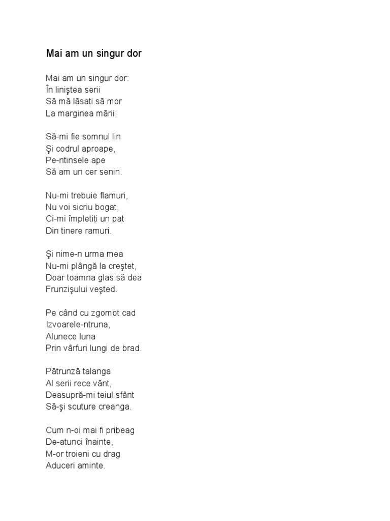 Un singur dor mai am si eu. Poezia mai am un singur dor de mihai eminescu. O dumnezeule ceresc tu ştii prea bine ce doresc. Să mi fie somnul lin şi codrul aproape pe ntinsele ape să am un cer senin. Să mi fie somnul lin şi codrul aproape pe ntinsele ape să am un cer senin.