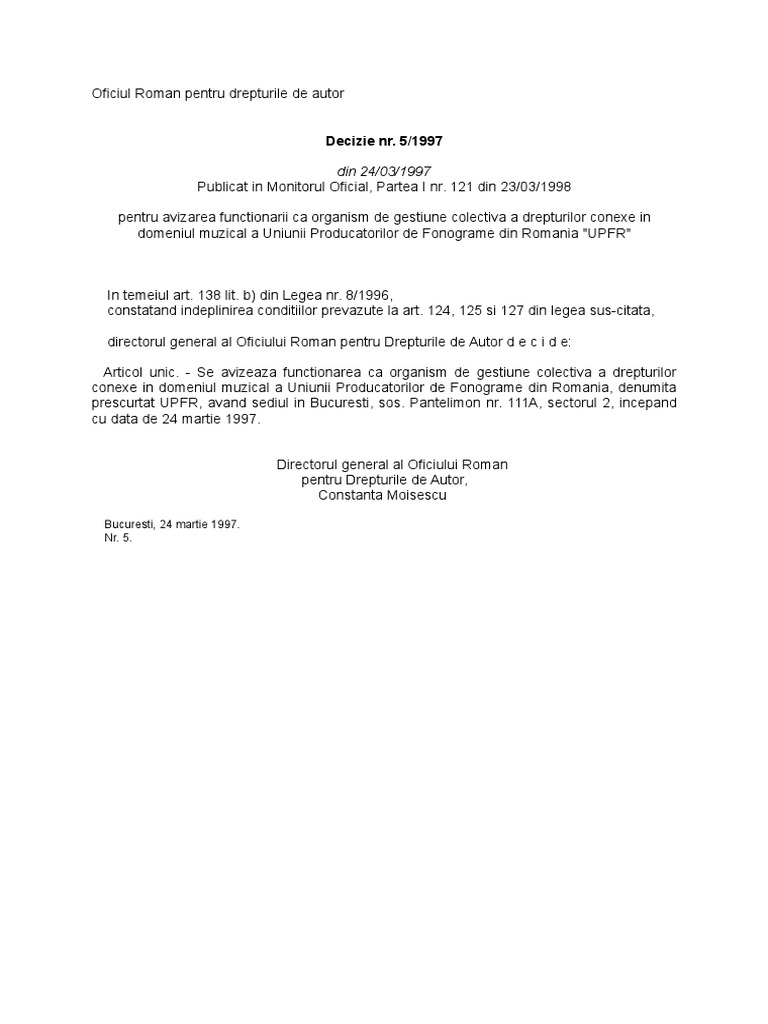 Uniunea producatorilor de fonograme din romania. Uniunea producatorilor de fonograme din romania a fost avizată să funcționeze ca organism de gestiune colectivă în baza deciziei nr 5 1997 a directorului general o r d a publicată în monitorul oficial al româniei partea i nr. Uniunea producatorilor de fonograme din romania. Află mai multe despre licențele emise de upfr apăsând butonul de mai jos. 2014 prezent.