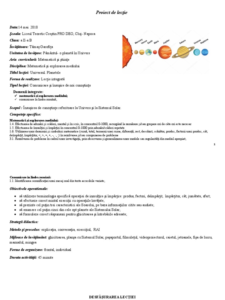 Universul Si Sistemul Solar Proiect De Lectie