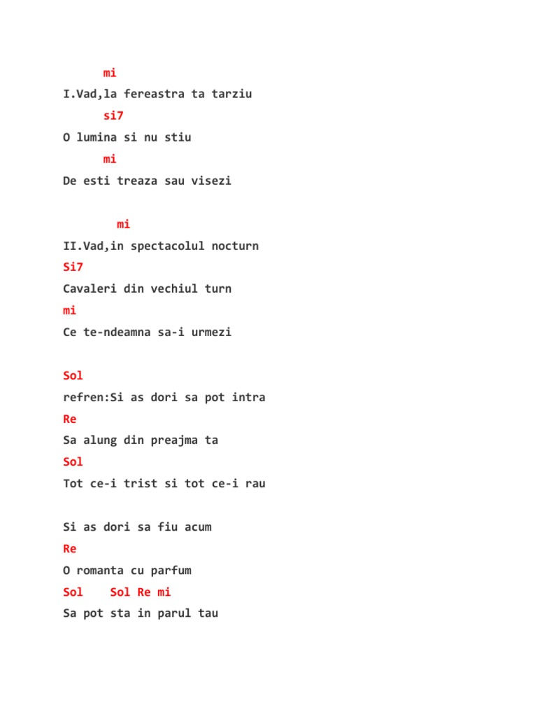 Vad la fereastra ta tarziu o lumina si nu stiu de esti treaza sau visezi. Vad in spectacolul nocturn cavaleri din vechiul turn ce te ndeamna sa i urmezi. Si as dori sa fiu acum o romanta cu parfum sa pot sta in parul tau. Em i vad la fereastra ta tarziu b7 o lumina si nu stiu em de esti treaza sau visezi em ii vad in spectacolul nocturn b7 cavaleri din vechiul turn em ce te ndeamna sa i urmezi g refren si as dori sa pot intra d sa alung din preajma ta g tot ce i trist si tot ce i rau si as dori sa fiu acum d o romanta cu parfum g g d em sa pot sta in parul tau em iii vad la fereastra ta tarziu b7 o lumina si nu stiu em daca razi sau daca plangi em iv trec si in drumu mi nesfarsit b7 ma primesc cu n bun venit.